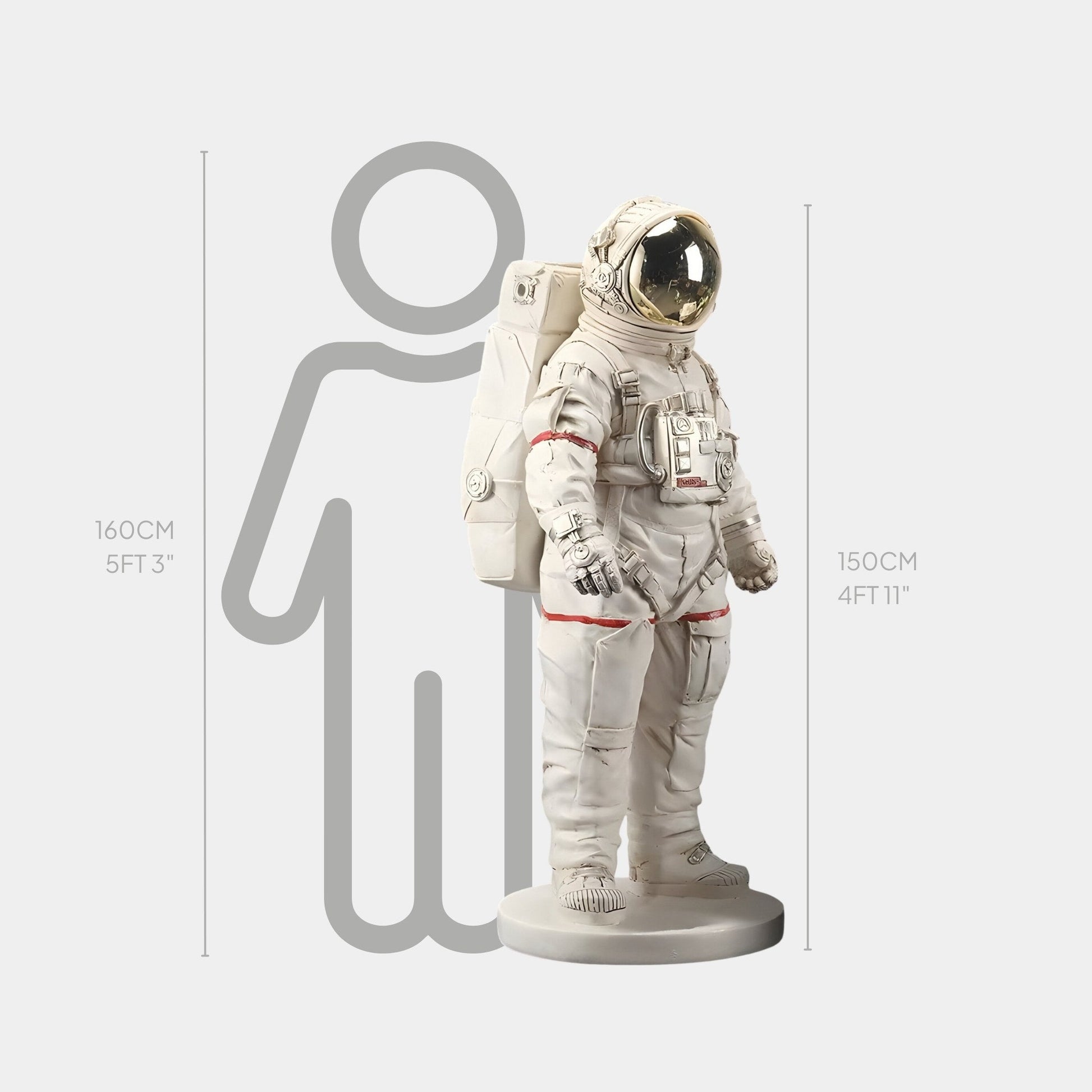 Expertly constructed from high-quality, impact-resistant resin, this sculpture offers a seamless balance of durability and sculptural precision. The astronaut’s clean white suit is accented with discreet red striping—subtle nods to classic mission aesthetics—while the gold mirror visor creates a luminous focal point, reflecting its surroundings with a radiant, otherworldly gleam.